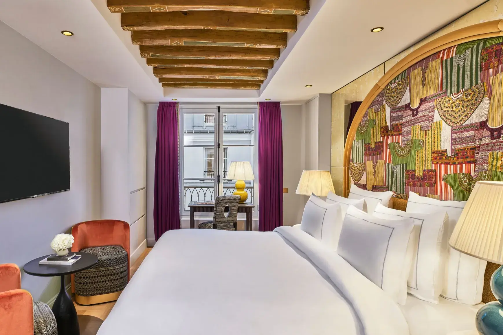 A private mansion between Place Vendôme and the Tuileries, conceived around a singular idea: 26 rooms, each one a portrait of an iconic woman. Opened in January 2025, designer Daniel Jibert had dressed every space differently — embossed velvet for Sarah Bernhardt, 18th-century fabrics for George Sand, skylights and solid wood beams for Marguerite Yourcenar. Versailles parquet, Pierre Frey textiles, hand-painted murals, bird sculptures by Clémentine de Chabaneix. The craftsmanship is French, and entirely unhurried. On the second floor, restaurant Frida opens onto a tree-lined courtyard, its South American menu a vivid counterpoint to the surrounding 1st arrondissement — one of the most storied, and most visited, corners of Paris. Maison Barrière understands the neighborhood and quietly offers something it rarely has: intimacy.